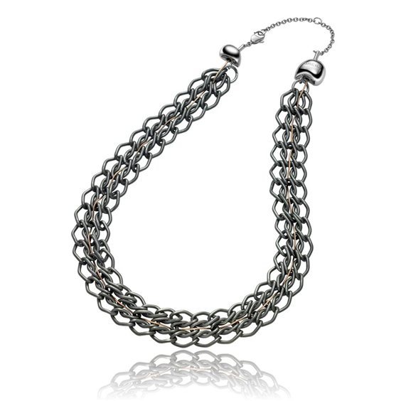 Collana in acciaio lucido con catena in alluminio anodizzato graphite con meccanismo di scorrimento. Catena a coda di topo in acciaio lucido e chiusura a moschettone. Lunghezza regolabile cm 45 a cm 50,5.