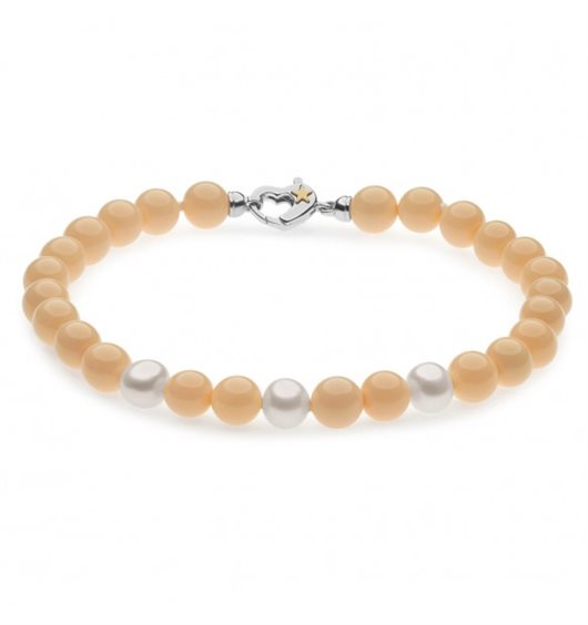 Filo di perle shell rosa dal diametro di 6 mm e tre perle coltivate centrali dal diametro di 6/6,5 mm. Chiusura a moschettone in argento 925% con stella in oro 18kt. Ha lunghezza di 18 cm.