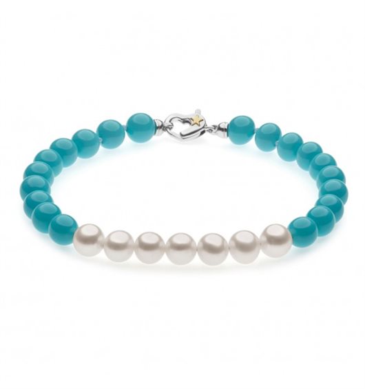 Filo di perle shell turchesi dal diametro di 6 mm e cinque perle coltivate centrali dal diametro di 6/6,5 mm. Chiusura a moschettone in argento 925% con stella i