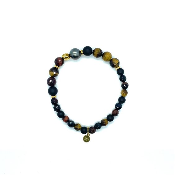 BRACCIALE CON ELEMENTI IN ARGENTO 925% CON GALVANICA IN ORO GIALLO, ONICE NERO E OCCHIO DI TIGRE.