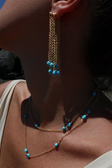 Voglia di estate e di mare... la collezione Turchina è perfetta per donare un tocco glamour ai tuoi outfit. Un consiglio, indossate i gioielli col turchese in tutti i periodi dell'anno, l'azzurro è chic sui colori del marrone, beige, nero. Il turchese naturale risulta non essere uguale di misura e col tempo cambia colore, ciò rende il gioiello unico. Argento 925 Turchese naturale Lunghezza cm 7,5 Realizzato in Italia