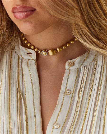 Ecco la classica collana di “perle” reinterpretata dalla nostra designer Laura: a comporla sono le nostre iconiche boules in oro 18kt incise a mano, per ore, con l’antica tecnica del bulino, fino a diventare leggere e soffici come la seta. Un gioiello che avvolge, reso ancora più unico dalla chiusura in diamanti che può essere allacciata a ciascuna boule oppure, perché no, unita al suo bracciale (BS12-538) per un effetto più allungato. Ref. CS44-538 Lunghezza 41,50 cm