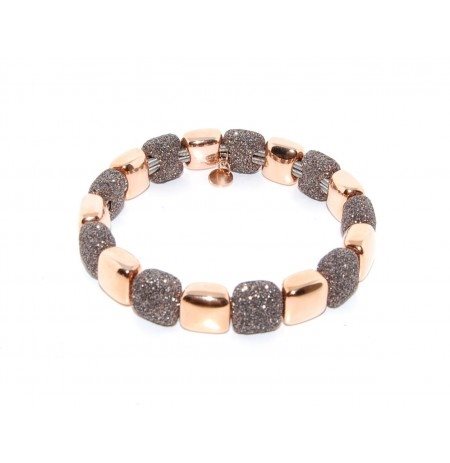Bracciale elastico con elementi quadrati alternati in argento rosè e èolvere dei sogni marrone.