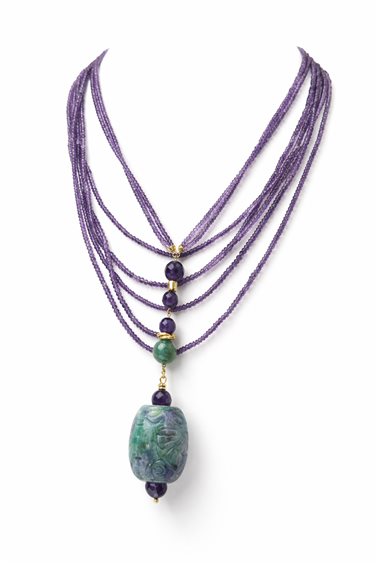 Collana con ametista naturali e giada incisa oro 750%. Scatola originale non disponibile.