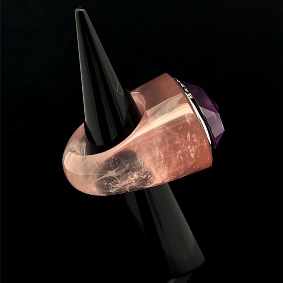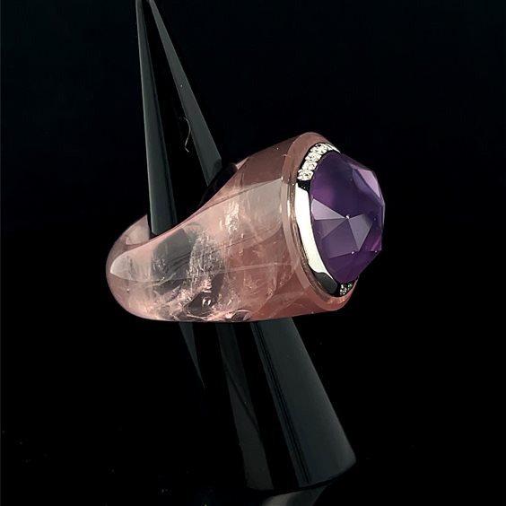 Anello con ametista oro diamanti e gambo scolpito in quarzo rosa