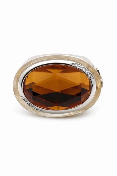 Anello in quarzo rutilato con topazio giallo e diamanti Anello di forte personalità caratterizzato da un importante gambo in quarzo rutilato naturale, attraversato da inclusioni dorate che creano un raffinato effetto materico e luminoso. La struttura ampia e scolpita valorizza la trasparenza del quarzo, rendendo ogni pezzo unico grazie alle sue venature interne. Al centro spicca un intenso topazio giallo sfaccettato, dalla tonalità calda e brillante, incastonato in una elegante montatura in oro bianco che ne esalta la luminosità. A impreziosire la composizione, una linea di diamanti naturali incastonati lateralmente aggiunge luce e preziosità, creando un raffinato contrasto tra la purezza del quarzo, il calore del topazio e la brillantezza delle gemme. Un gioiello scenografico, contemporaneo e distintivo, perfetto per chi ama pezzi unici dal design deciso.