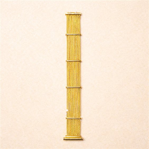 Bracciale elegante realizzato con una raffinata maglia multipla intrecciata, composta da sottili fili metallici che creano un effetto compatto, luminoso e flessibile al polso. Il design è impreziosito da elementi cilindrici lisci che scandiscono la struttura, donando equilibrio e carattere al gioiello. La lavorazione accurata garantisce una vestibilità confortevole e una resa estetica di grande impatto, ideale sia per l’uso quotidiano sia per occasioni più eleganti. • Lunghezza: 18 cm • Larghezza: 2 cm Un bracciale dal gusto contemporaneo, sofisticato e versatile, pensato per chi apprezza gioielli importanti ma estremamente raffinati.