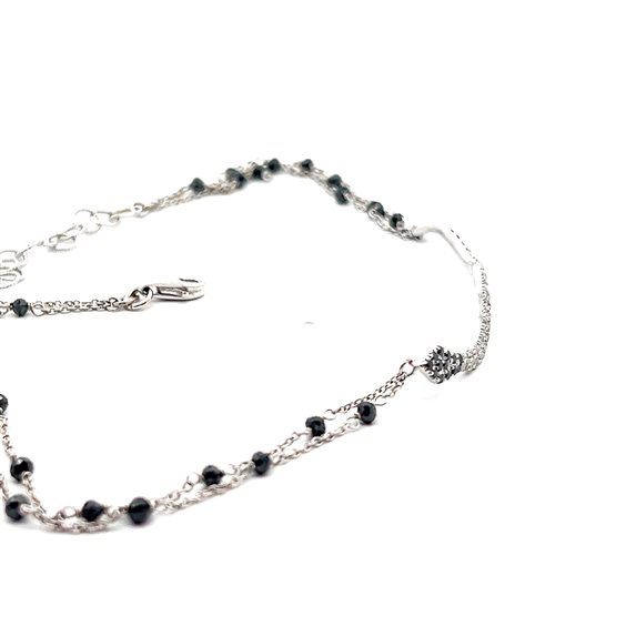 Questa collana choker in oro bianco presenta un design sinuoso e raffinato ispirato alla forma di un serpente. Il corpo del serpente è impreziosito da un pavé di diamanti bianchi e diamanti neri, creando un contrasto elegante e sofisticato. La sinuosità del design dona un effetto fluido e dinamico, esaltando la lucentezza delle pietre incastonate. La catena, sottile e delicata, è arricchita da piccoli